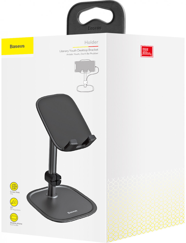 В «Baseus Literary Youth Desktop Bracket» использовано специальное покрытие, которое исключит появление царапин и потертостей на корпусе смартфона. Конструкция держателя выполнена таким образом, чтобы исключить вероятность падения устройства. Также в модели имеется органайзер для проводов, в котором можно зафиксировать кабель зарядки.