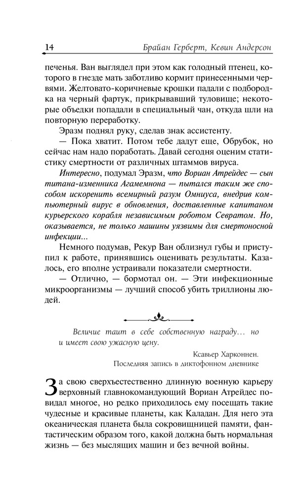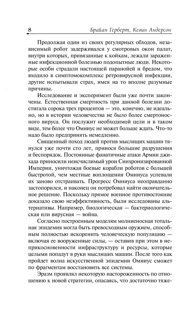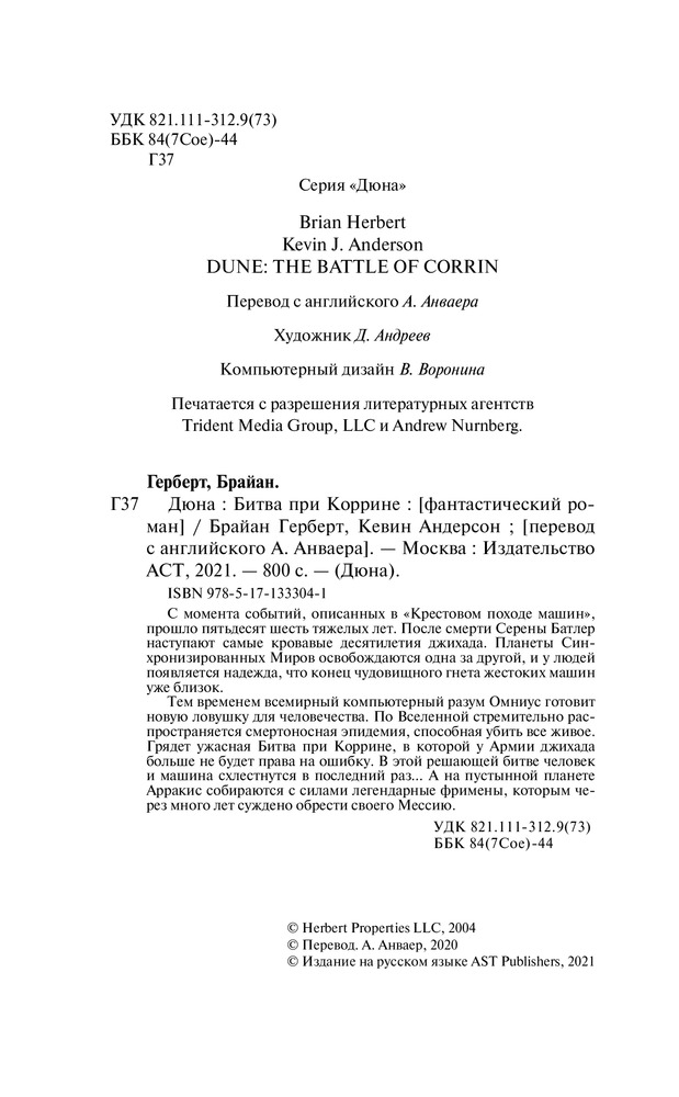 Тем временем всемирный компьютерный разум Омниус готовит новую ловушку для человечества. По Вселенной стремительно распространяется смертоносная эпидемия, способная убить все живое. Грядет ужасная Битва при Коррине, в которой у Армии джихада больше не будет права на ошибку. В этой решающей битве человек и машина схлестнутся в последний раз... А на пустынной планете Арракис собираются с силами легендарные фримены, которым через много лет суждено обрести своего Мессию. |