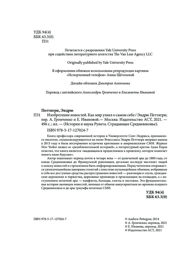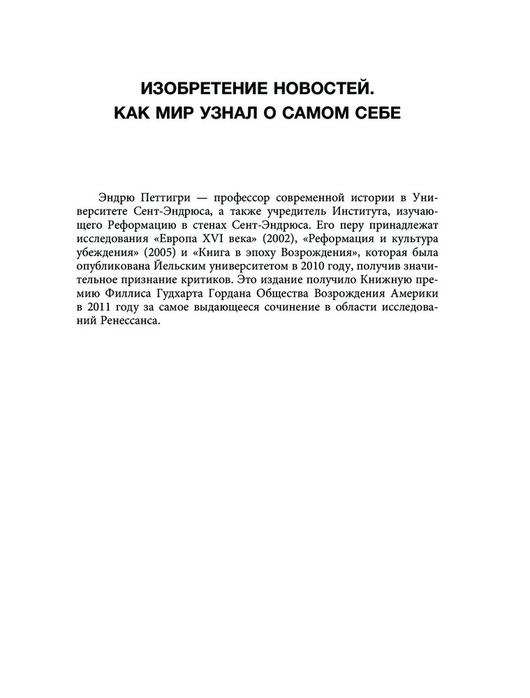 Изобретение новостей. Как мир узнал о самом себеВ данный момент этот товар отсутствует в продаже. Возможно, у нас найдется аналогичный или похожий товар здесь. Серия: История и наука рунета. Страдающее средневековье Книга профессора современной истории в Университете Сент-Эндрюса, признанного писателя, специализирующегося на эпохе Ренессанса Эндрю Петтигри впервые вышла в 2015 году и была восторженно встречена критиками и американскими СМИ. Журнал New Yorker назвал ее «разоблачительной историей», а литературный критик Адам Кирш отметил, что книга является «выдающимся предисловием к прошлому, которое помогает понять наше будущее». |