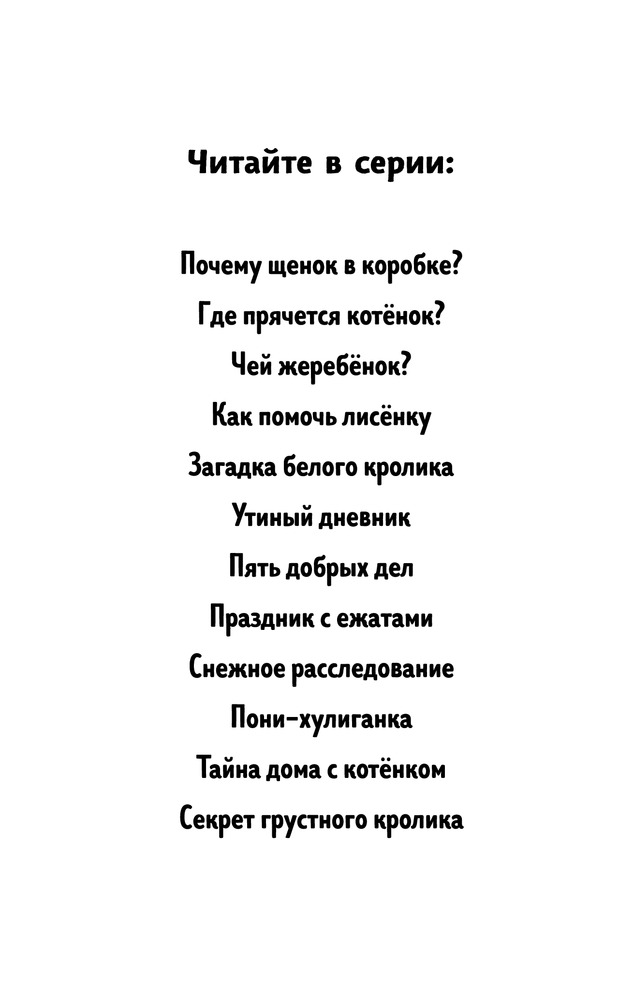 Секрет грустного кроликаВ данный момент этот товар отсутствует в продаже. Возможно, у нас найдется аналогичный или похожий товар здесь. Серия: Детск. Лапа дружбы. Команда спасения животных В ветеринарную клинику при центре спасения животных «Лапа дружбы» принесли кролика. Кролик здоров, у него очень внимательная и заботливая хозяйка, но почему-то с каждым днём малыш всё грустнее и грустнее. Ева, юный волонтёр центра, удивлена и обеспокоена. С таким случаем она ещё не сталкивалась. А это значит что? Что надо расследовать тайну грустного кролика! |