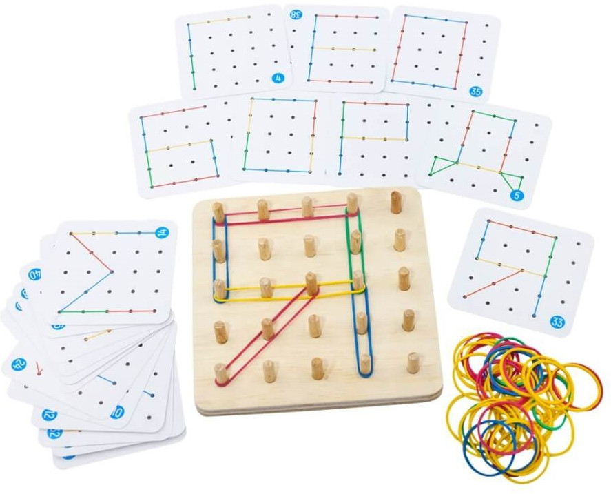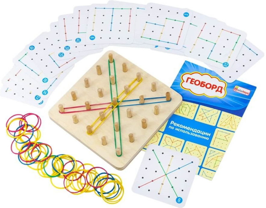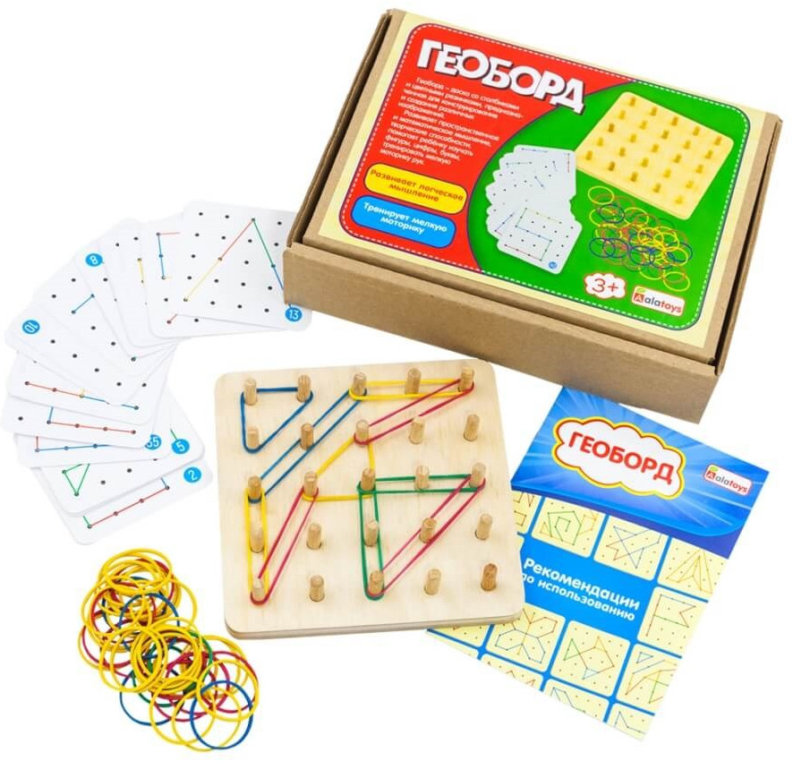 Alatoys Геобордуровни сложности возрастной диапазон размер коробки упаковка В данный момент этот товар отсутствует в продаже. Возможно, у нас найдется аналогичный или похожий товар здесь. Развивающий деревянный Геоборд — это деревянная доска-основание со штырьками, между которыми натягиваются резиночки. |