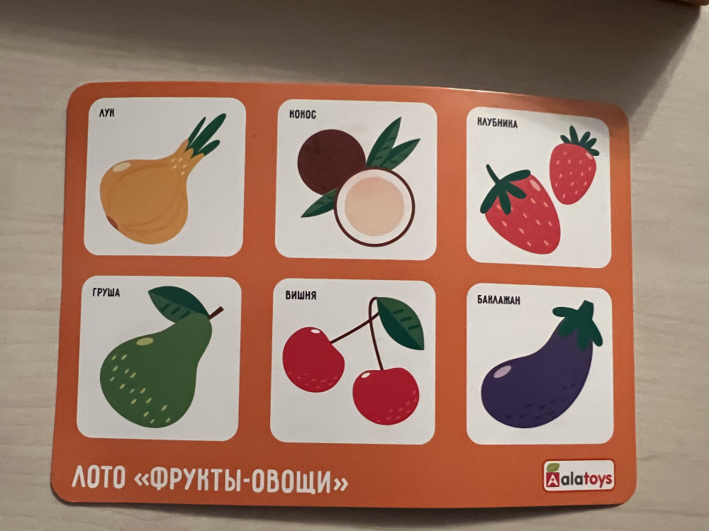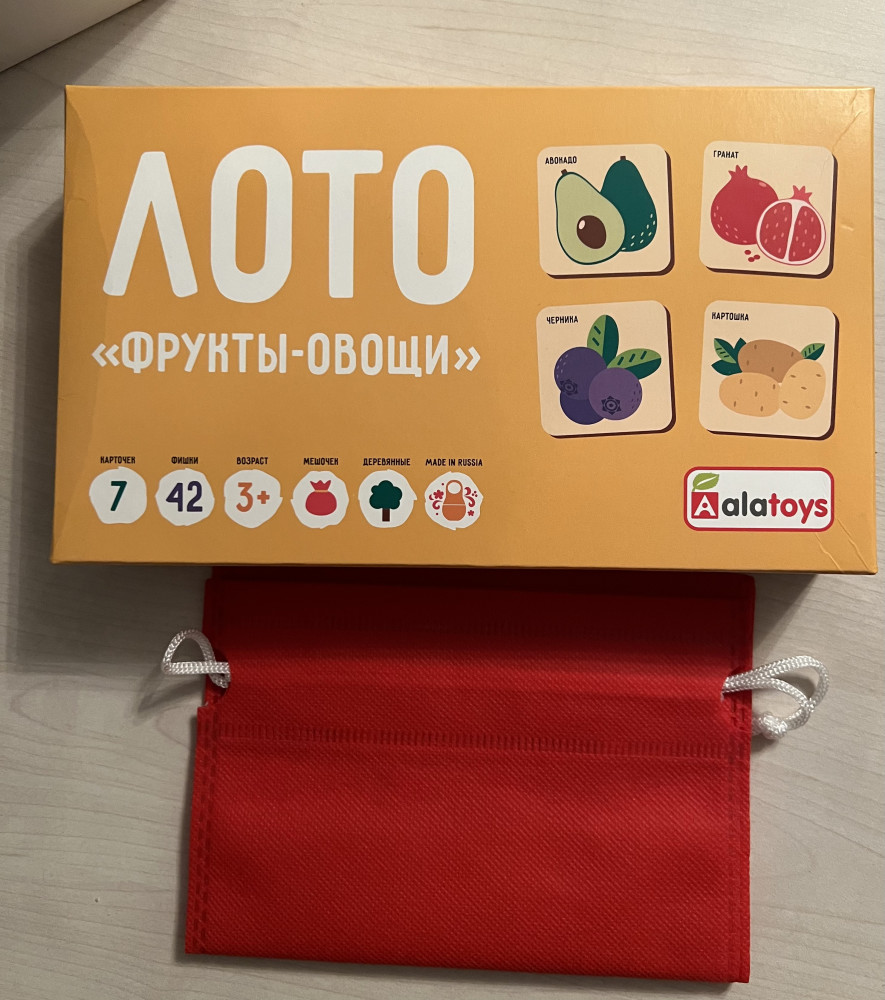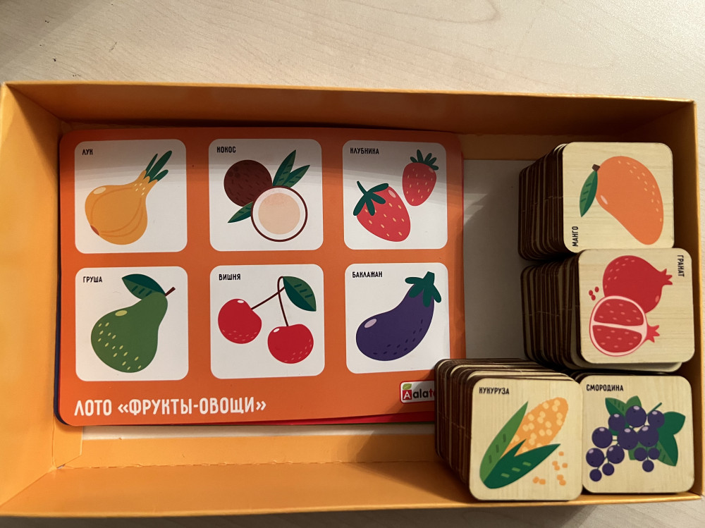 Качество лото приятно удивило, фишки деревянные очень хорошего качества, гладкие, рисунки на фишках яркие, не стираются, на каждой фишке написано название фруктов или овощей, очень удобно. Карточки не сильно тонкие, если пользоваться аккуратно, не помнутся. В наборе специальный мешочек и удобная коробка чтобы сложить фишки и карточки. Набором очень довольная!