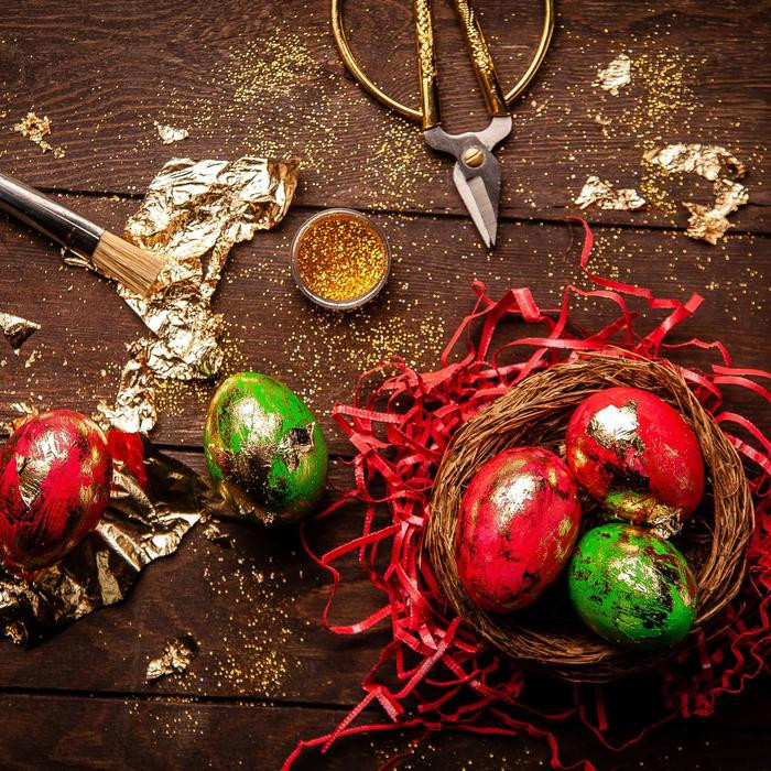 К сожалению красителем осталась недовольна. Очень уж он слабый, хотя разбавила все как в инструкции. В итоге яйцо пролежав час, так толком и не окрасилось, а краска легко сошла. Что касается декора, то думаю блёстки и фольгу всегда можно купить отдельно в отделах для творчества, а сами яйца окрашивать другим красителем. В общем не рекомендую.