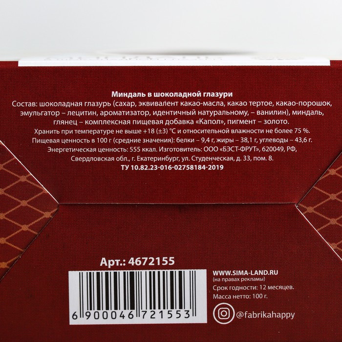 Фабрика счастья Миндаль в шоколадной глазури «Со светлой Пасхой»В данный момент этот товар отсутствует в продаже. Возможно, у нас найдется аналогичный или похожий товар здесь. Серия: Пасха Миндаль в шоколаде — изысканное лакомство для любителей сладкого. Многим нравится его неповторимый вкус и специфический аромат, который ни с чем другим не спутаешь. Но помимо гастрономического наслаждения указанный десерт обладает еще одним важным преимуществом — он потенциально полезен для укрепления здоровья. Миндаль — богат минералами. Такого количество кальция нет ни в одном другом виде орехов. Также миндаль богат на калий, магний и цинк. |