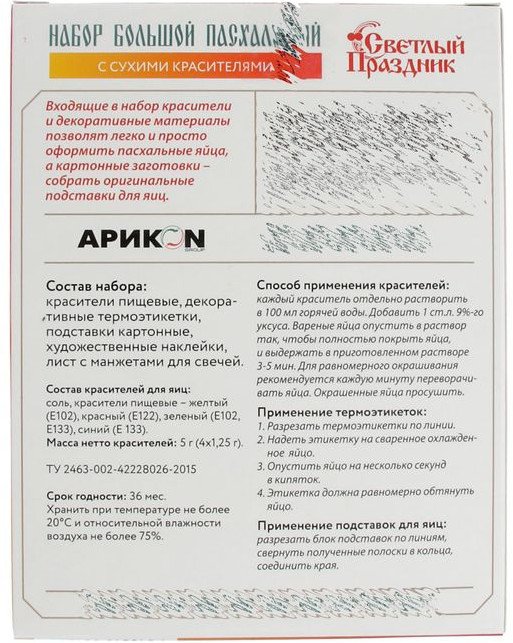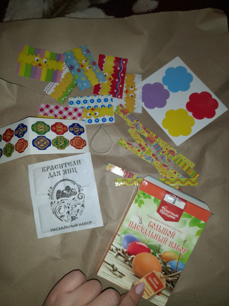 💳 Оплатить за товар можно при получении 🇰🇿 Есть бесплатная доставка по Казахстану от 1 дня 🎁 Копите бонусы с каждой покупки С помощью этого набора вы сможете окрасить пасхальные яйца. Помимо красителей в набор также входят классические наклейки, которыми можно украсить цветные или обычные яйца. |