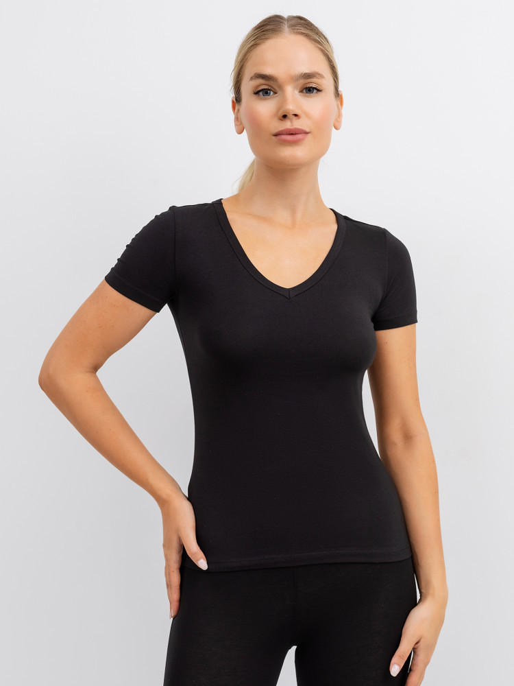 Футболка приятная к телу. Немного коротковата. Вырез не глубокий. Заказала еще,