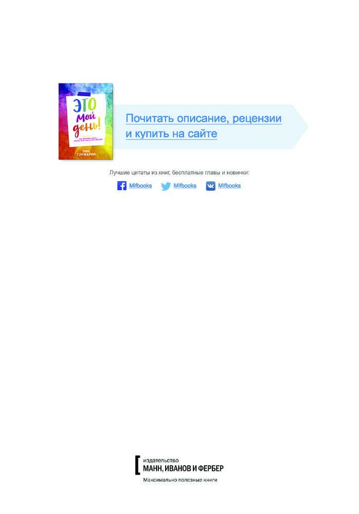 Это мой день! Как наполнить жизнь творчеством, радостью и смысломВ данный момент этот товар отсутствует в продаже. Возможно, у нас найдется аналогичный или похожий товар здесь. Серия: Психология творчества Как находить время для творчества каждый день. |