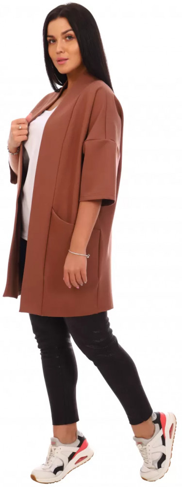 понравился, размер в размер,летом с утра по прохладе на платье, на брюки как раз, ткань тянется, немного тяжеловата, цвет кофе