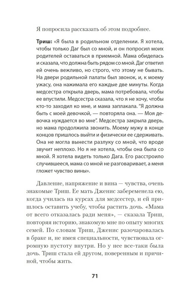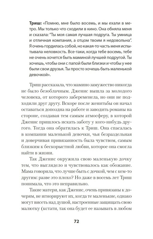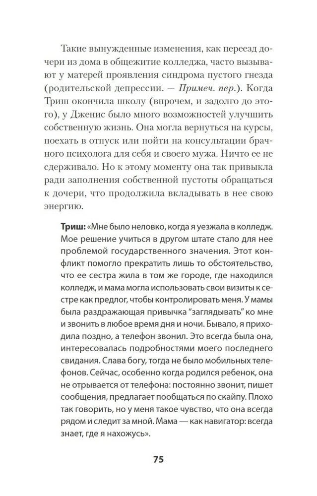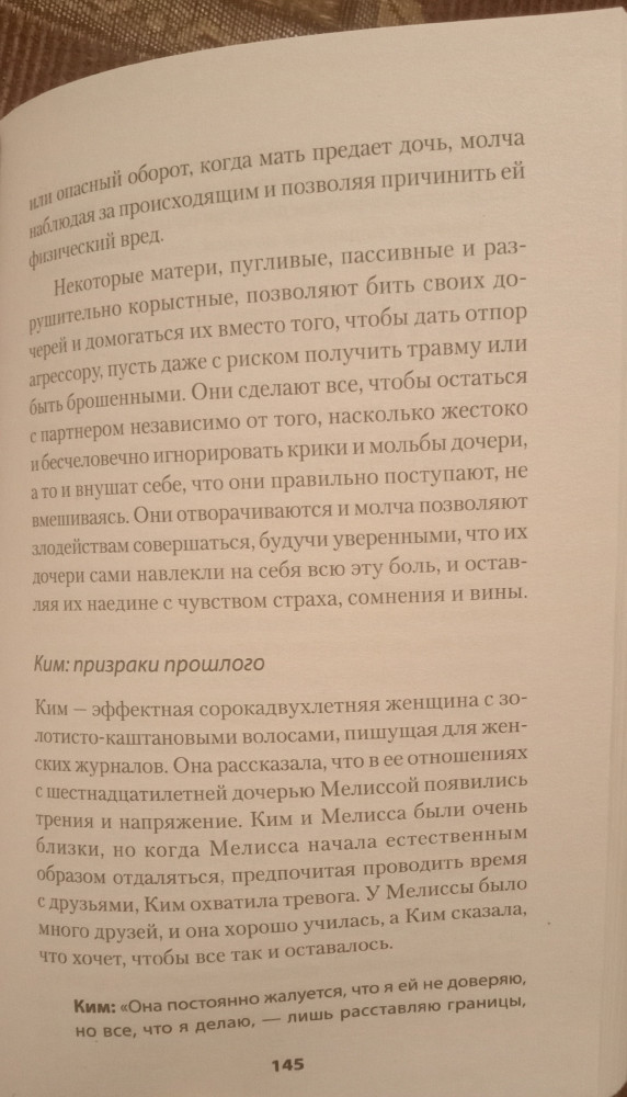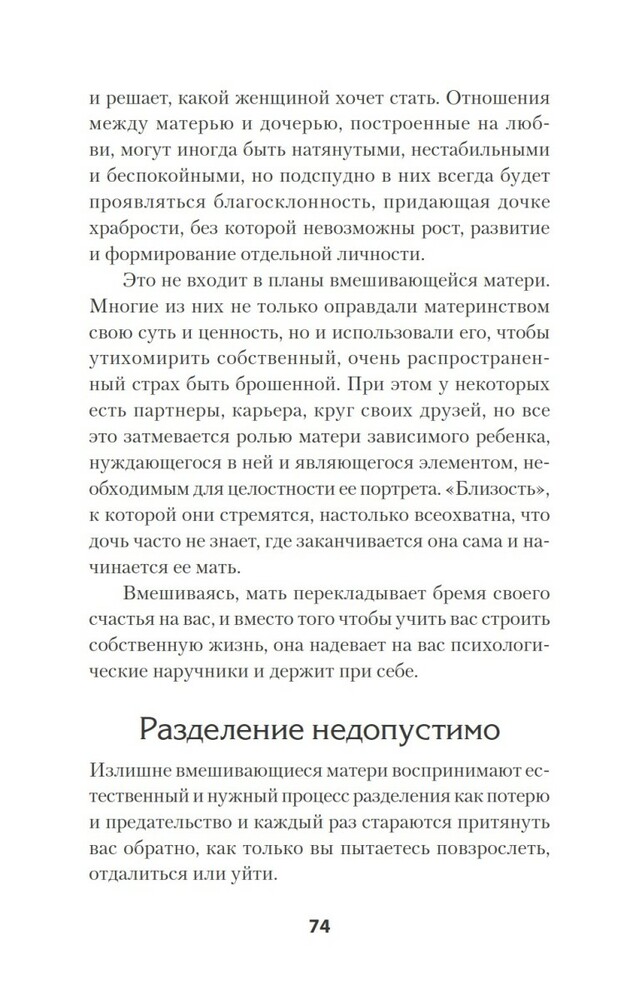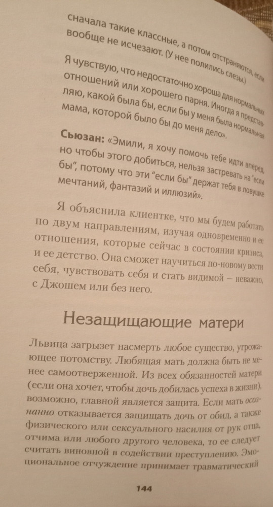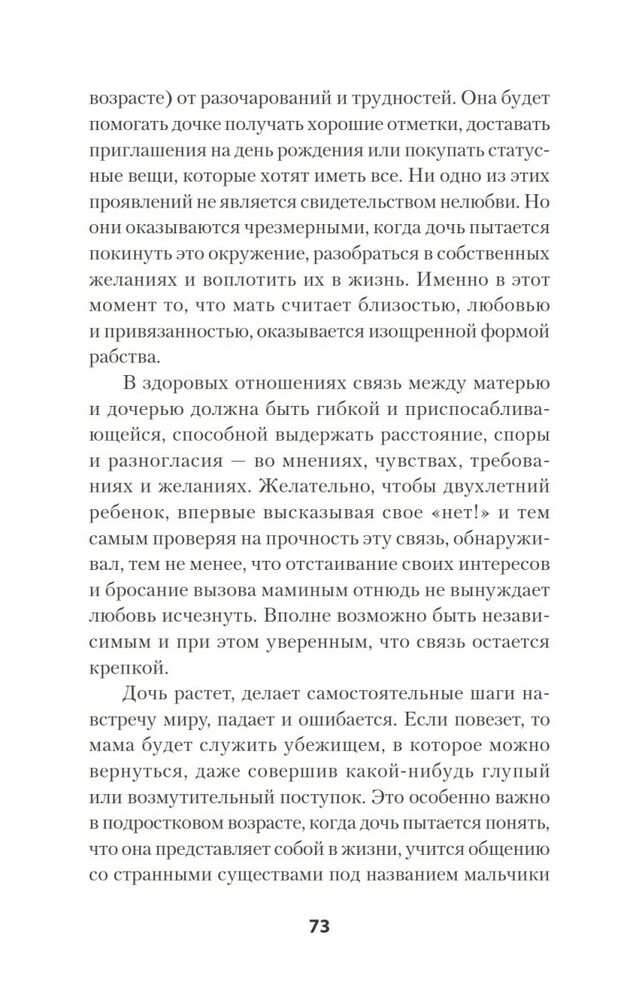 Мне понравилось содержание. Многие модели поведения отметила у знакомых, хотя раньше считала их "вполне себе" и не понимала недовольства их дочерей. Многое становится на место и самое главное, мифы о материнстве развеяны. Думаю, эту книгу нужно прочитать каждой женщине, которая готовится и хочет стать хорошей матерью для своей дочери, и дать ей необходимый фундамент для построения успешной, психологически здоровой личности. главное быть уверенной в том, что вы готовы разорвать межпоколенческое травмированное отношение мать -> дочь