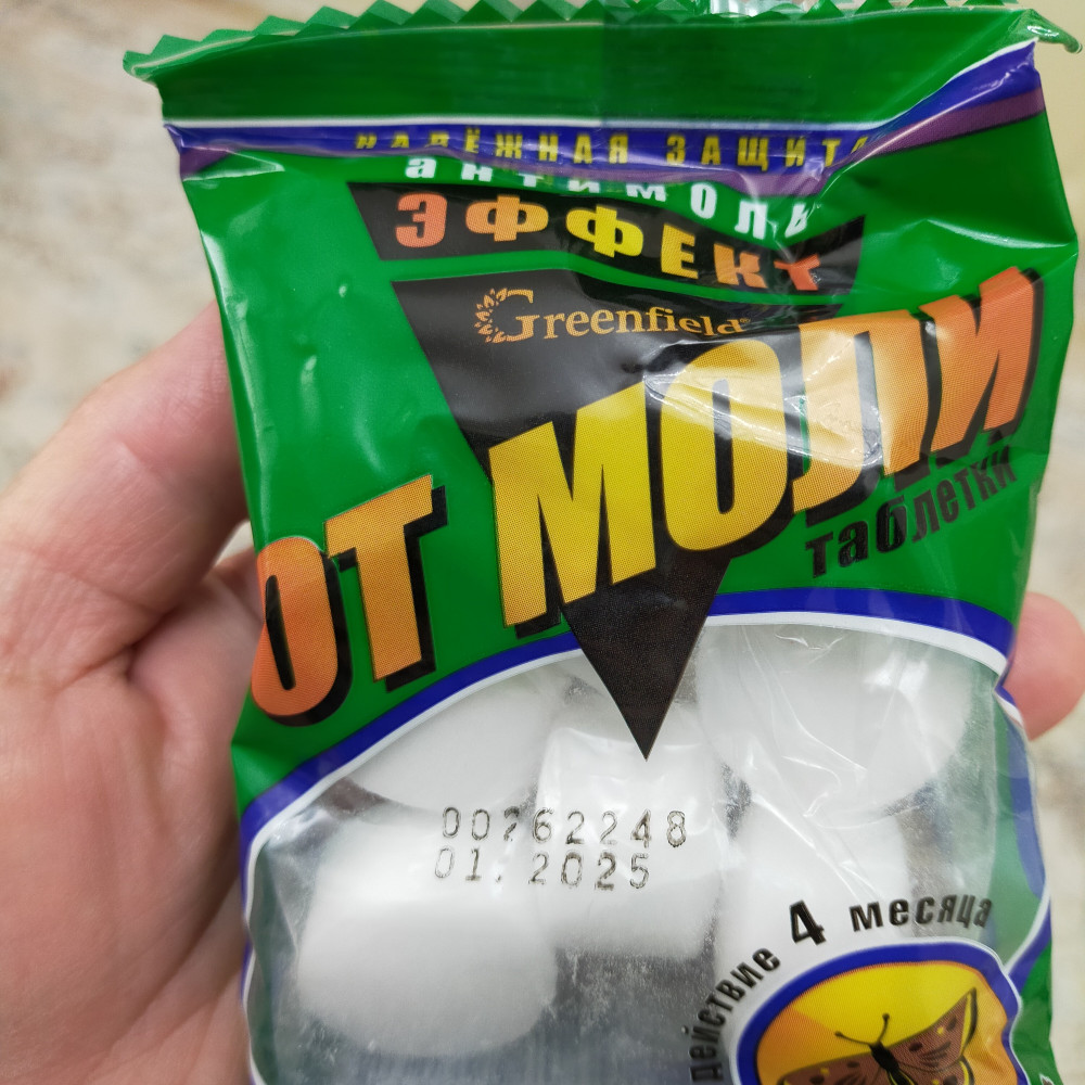 Пользуемся этими таблетками на протяжении многих лет, результат отличный, моль начисто забыла дорогу к нашим теплым вещам. В местных магазинах не найти, спасибо флипу за наличие, демократичную цену и быструю доставку!