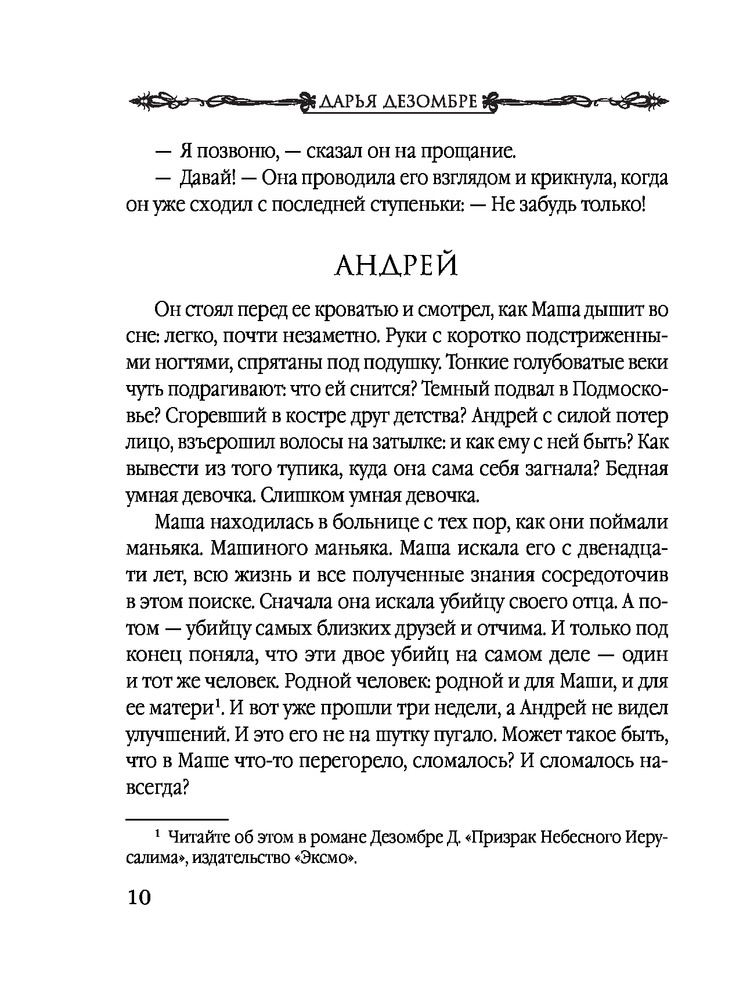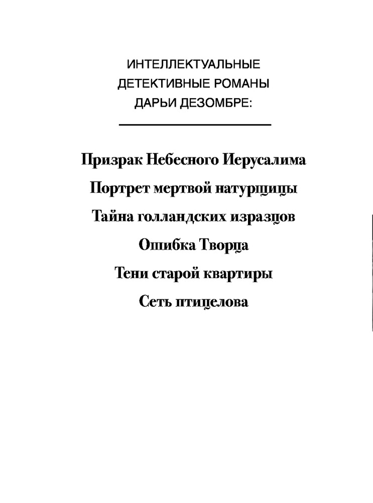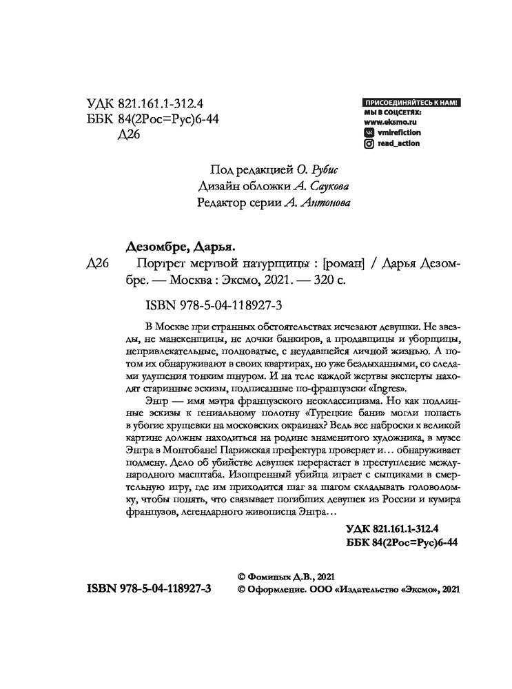Портрет мертвой натурщицыВ данный момент этот товар отсутствует в продаже. Возможно, у нас найдется аналогичный или похожий товар здесь. Серия: Бест прайс. Современный российский детектив (обложка) В Москве при странных обстоятельствах исчезают девушки. Не звезды, не манекенщицы, не дочки банкиров — а продавщицы и уборщицы, непривлекательные, с неудавшейся личной жизнью. После девушек находят в их квартирах, но уже бездыханными, со следами удушения тонким шнуром. На теле каждой жертвы оставлено по старинному эскизу, подписанному по-французски «Ingres». Энгр — имя мэтра французского неоклассицизма. Но как подлинные эскизы к гениальному полотну «Турецкие бани» могли попасть в убогие хрущевки на московских окраинах? Ведь все наброски к великой картине хранятся на родине знаменитого художника, в музее Энгра в Монтобане! Парижская префектура проверяет и... обнаруживает подмену. Дело об убийстве девушек перерастает в преступление международного масштаба. Убийца играет с сыщиками в смертельную игру, где им придется шаг за шагом складывать головоломку, чтобы понять, что связывает погибших девушек с московской окраины и кумира французов — легендарного живописца Энгра... |