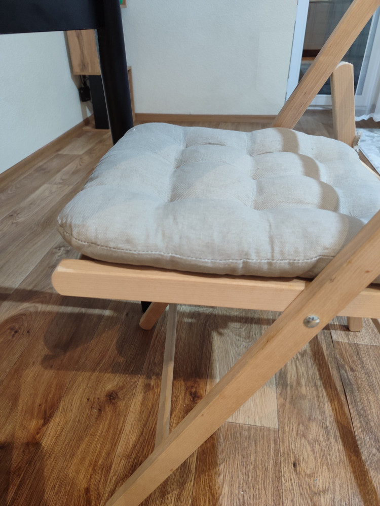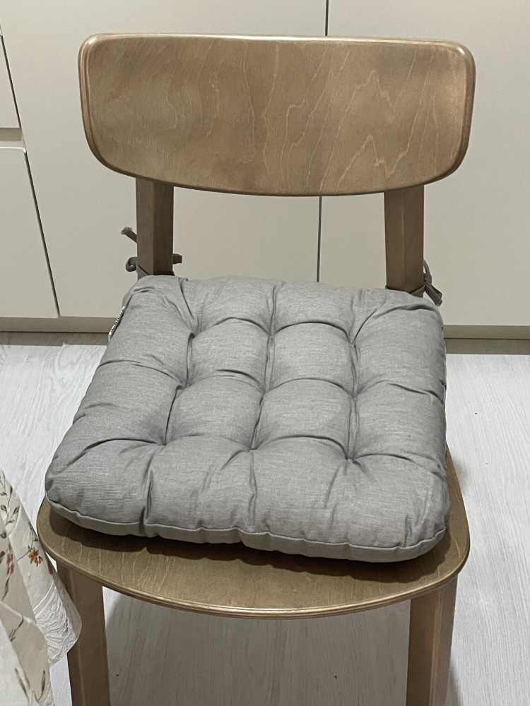 хорошая подушка на стул! прикольно, что при покупке она объемная, после использования в течение какого- то времени становится более плоской (2,5 месяца сидим на них). Первое фото - это новая подушка, второе фото 2,5 месяца в использовании))