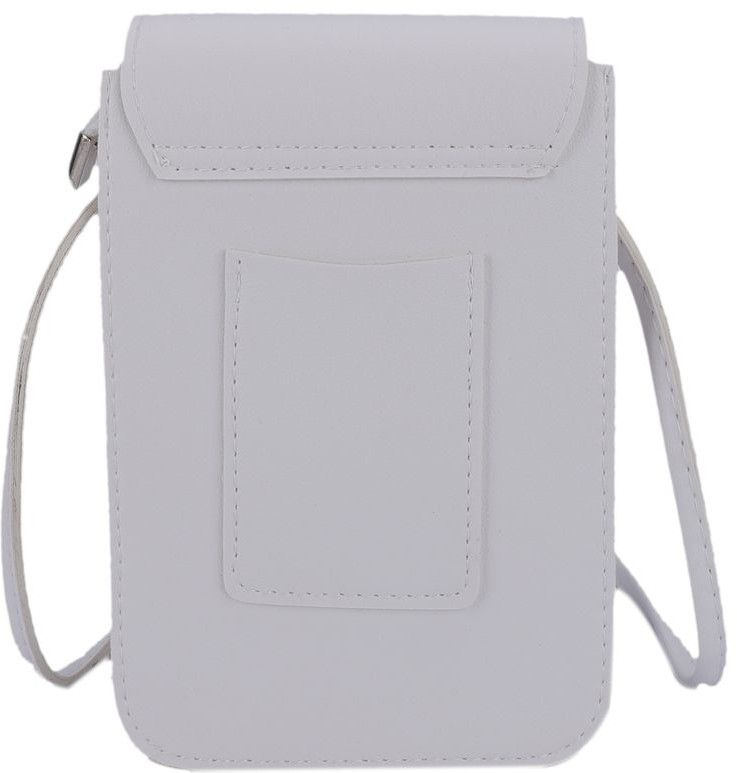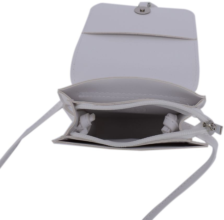 Несмотря на миниатюрный вид, внутри находится три отделения. Среднее отделение побольше — в него помещаются телефон, кошелек и ключи. Два других маленькие — для мелочей: ручка, карандаш, тушь, небольшой блокнот. На тыльной стороне кармашек для банковской карты — можно ее не доставать при бесконтактной оплате. При небольших размерах минимальный дамский набор в сумочке легко помещается.