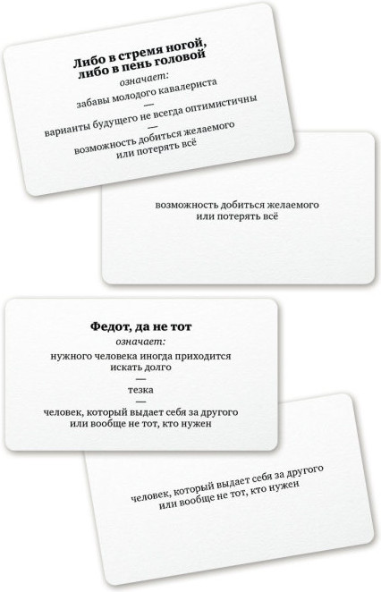 Данная викторина понравилась и мне и сыну (9лет). Многие пословицы и поговорки я не слышала, что добавляет интерес к этой игре. Карточки из плотного картона, размер небольшой. Удобно брать в дорогу.
