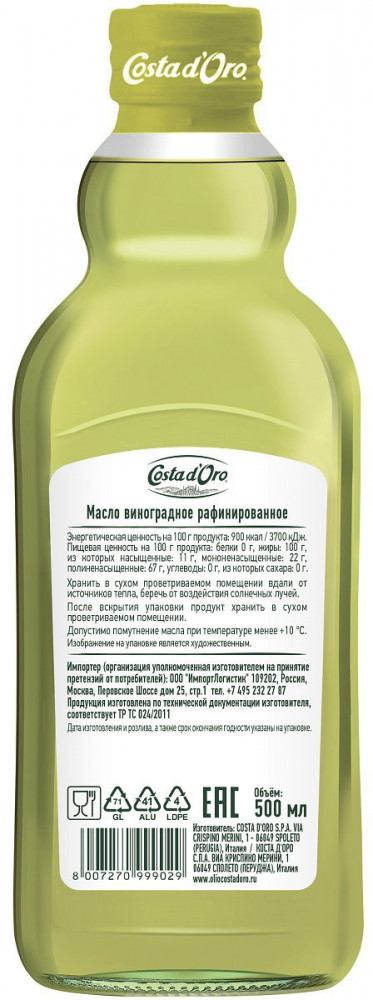 Costa d'Oro Масло виноградное рафинированное+79 вкус для салатов консистенция полезное