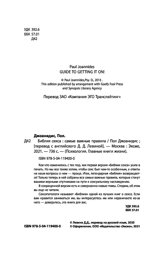 Библия секса. Самые важные правилаВ данный момент этот товар отсутствует в продаже. Возможно, у нас найдется аналогичный или похожий товар здесь. Серия: Психология. Главные книги жизни Кое-что изменилось с тех пор, как первая версия «Библии секса» ушла в печать. Но мы все так же хотим, чтобы секс был чем-то особенным, а ответы на наши вопросы о нем — проще. Итак, легендарная «Библия» возвращается! Только теперь в ней собраны все самые важные правила, которые станут вашими верными спутниками на пути к сексуальному наслаждению. |