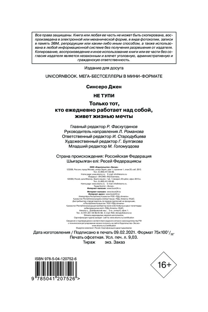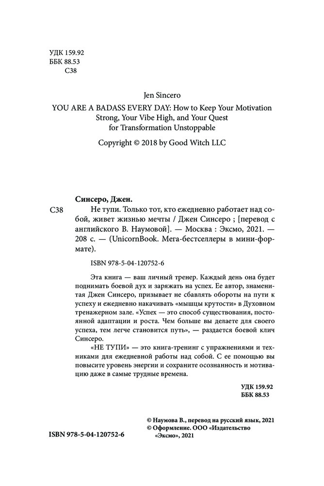 💳 Оплатить за товар можно при получении 🇰🇿 Есть бесплатная доставка по Казахстану 🎁 Копите бонусы с каждой покупки Серия: UnicornBook. Мега-бестселлеры в мини-формате Эта книга — ваш личный тренер. Каждый день она будет поднимать боевой дух и заряжать на успех. Ее автор, знаменитая Джен Синсеро, призывает не сбавлять обороты на пути к успеху и ежедневно накачивать «мышцы крутости» в Духовном тренажерном зале. «Успех — это способ существования, постоянной адаптации и роста. Чем больше вы делаете для своего успеха, тем легче становится путь», — раздается боевой клич Синсеро. |