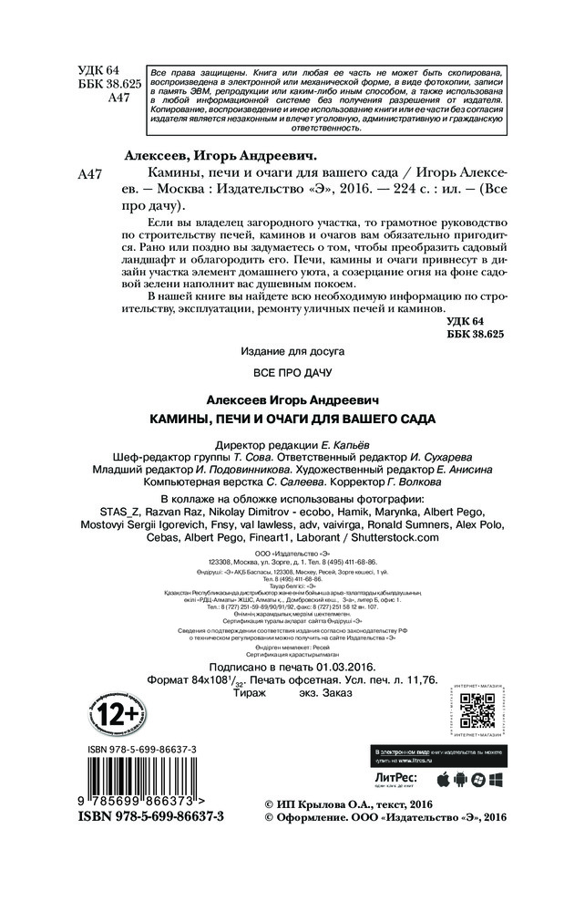 Камины, печи и очаги для вашего садаВ данный момент этот товар отсутствует в продаже. Возможно, у нас найдется аналогичный или похожий товар здесь. Серия: Все про дачу (обложка) Если вы владелец загородного участка, то грамотное руководство по строительству печей, каминов и очагов вам обязательно пригодится. Рано или поздно вы задумаетесь о том, чтобы преобразить садовый ландшафт и облагородить его. Печи, камины и очаги привнесут в дизайн участка элемент домашнего уюта, а созерцание огня на фоне садовой зелени наполнит вас душевным покоем. |