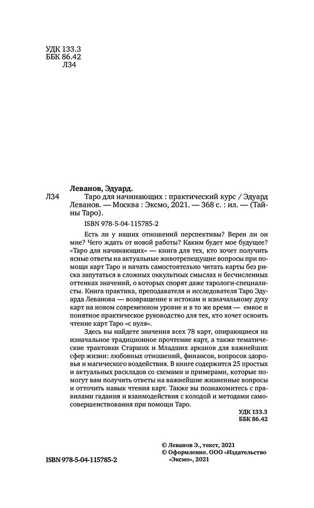 💳 Оплатить за товар можно при получении 🇰🇿 Есть бесплатная доставка по Казахстану 🎁 Копите бонусы с каждой покупки Серия: Тайны таро Есть ли у наших отношений перспективы? Верен ли он мне? Чего ждать от новой работы? Каким будет мое будущее? «Таро для начинающих» — книга для тех, кто хочет получить ясные ответы на актуальные животрепещущие вопросы при помощи карт Таро и начать самостоятельно читать карты без риска запутаться в сложных оккультных смыслах и бесчисленных оттенках значений, о которых спорят даже тарологи-специалисты. Книга практика, преподавателя и исследователя Таро Эдуарда Леванова — возвращение к истокам и изначальному духу карт на новом современном уровне и в то же время — емкое и понятное практическое руководство для тех, кто хочет освоить чтение карт Таро «с нуля». |