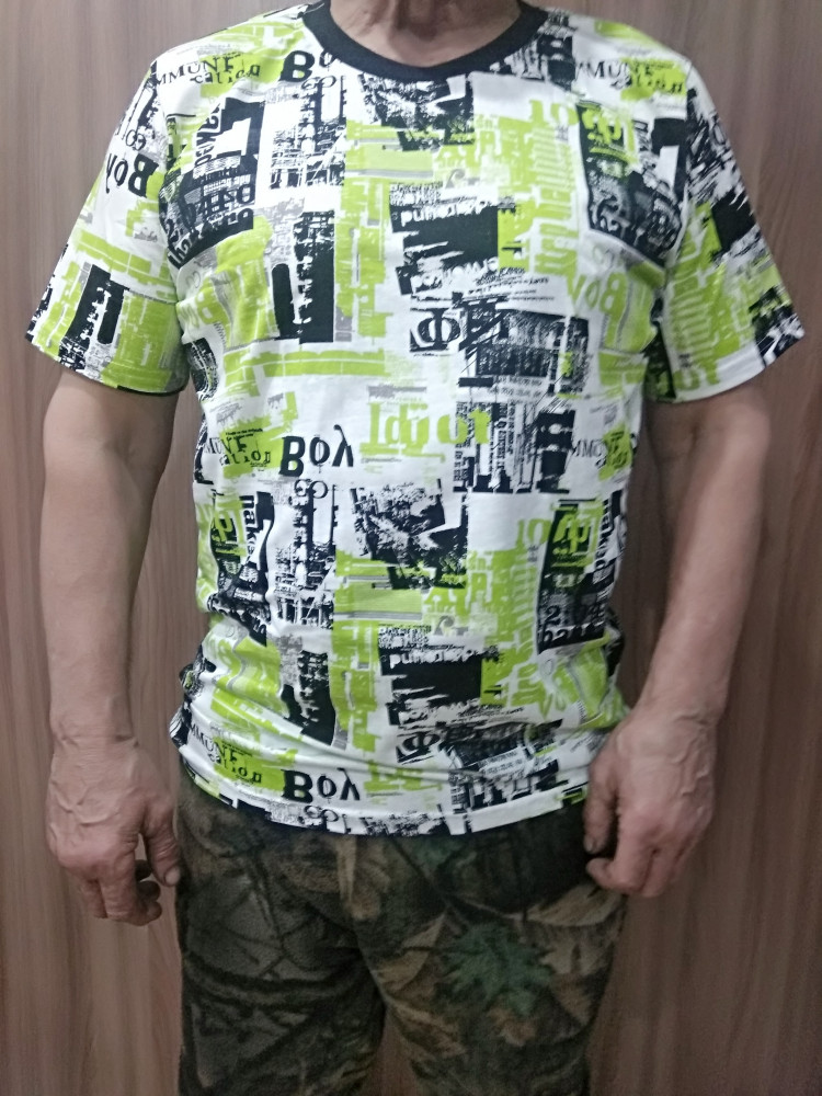 Качественная футболка из хлопка. Выбрал зелёного цвета и 62 размера. Подошла на удивление в самый раз. Ношу, заправив в трико.