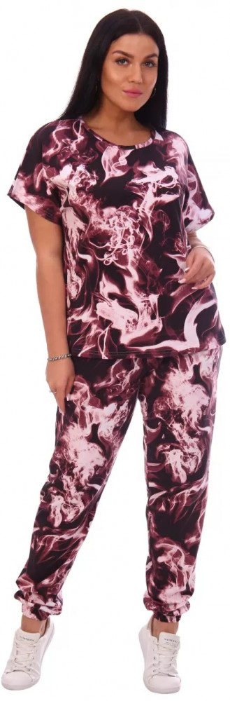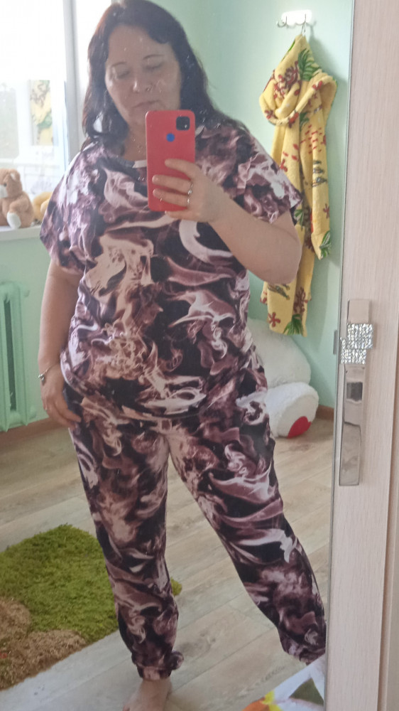 Неплохой летний прогулочный комплект. К телу приятный,что также немаловажно,на высокий рост(170) штаны сели нормально.Для меня слишком разноцветный,но оставила для разнообразия в гардеробе.