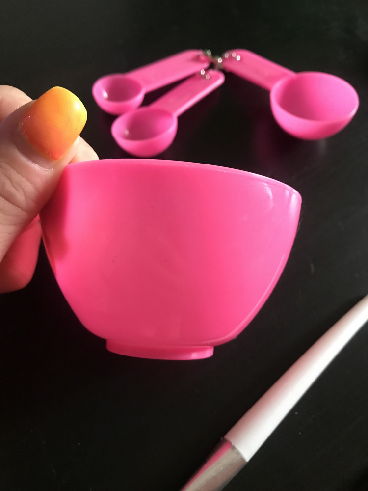 Миска с размер женский кулак,даже меньше. Мерные ложки,кисточка,лопатка удобные