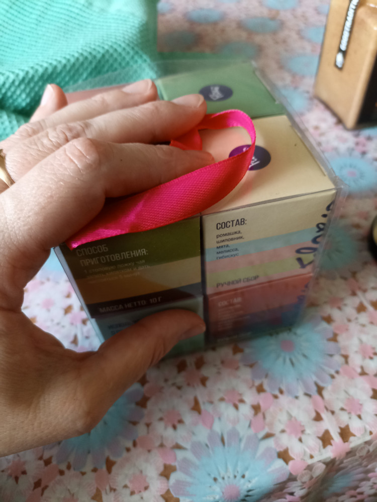хороший вариант для подарка. внутри 8 маленьких коробочк, в каждой примерно 1 столовая ложка чая разных вкусов