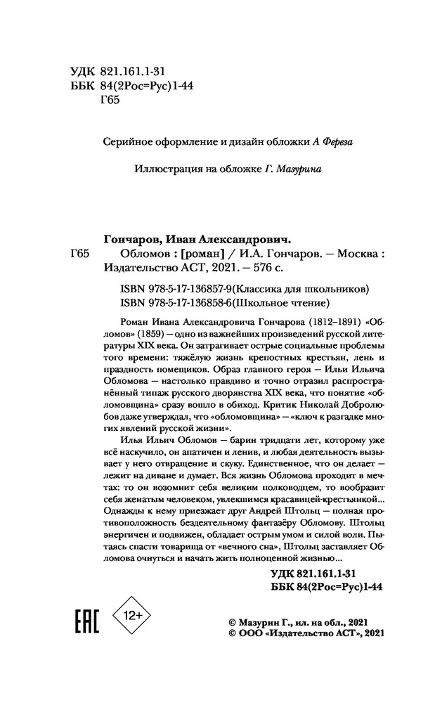 ОбломовВ данный момент этот товар отсутствует в продаже. Возможно, у нас найдется аналогичный или похожий товар здесь. Серия: Классика для школьников Роман Ивана Александровича Гончарова (1812–1891) «Обломов» (1859) — одно из важнейших произведений русской литературы XIX века. Он затрагивает острые социальные проблемы того времени: тяжёлую жизнь крепостных крестьян, лень и праздность помещиков. Образ главного героя — Ильи Ильича Обломова — настолько правдиво и точно отразил распространённый типаж русского дворянства XIX века, что понятие «обломовщина» сразу вошло в обиход. Критик Николай Добролюбов даже утверждал, что «обломовщина» — «ключ к разгадке многих явлений русской жизни». |