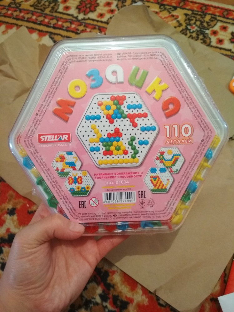 Нам мозаика понравилась, есть образец какие картинки можно собрать, не большая размером, но для первого ознакомления в самый раз!
