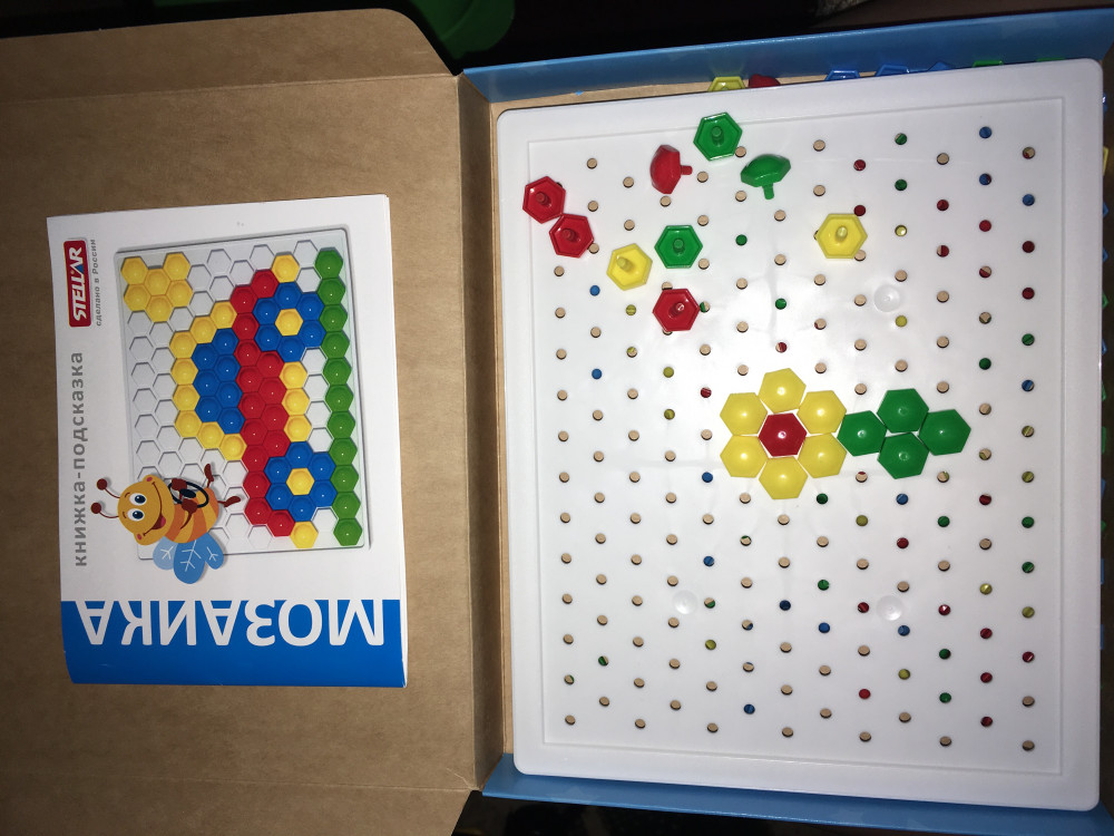 Отличная мозаика, сразу детство вспомнила, пластик очень прочный, цвета яркие, хорошая книжечка с подсказками, ребёнок каждый день играет.