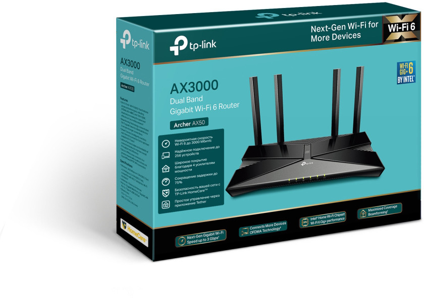 Четыре внешние антенны с высоким коэффициентом усиления и технология Beamforming объединяются для расширения мощного и надежного Wi-Fi по всему вашему дому. Передовые технологии Wi-Fi 6, такие как BSS Color, обеспечивают плавное и стабильное соединение, устраняя помехи сигнала от ваших соседей.