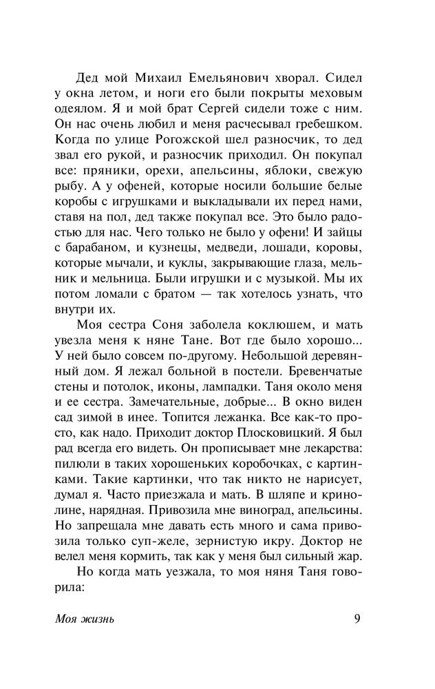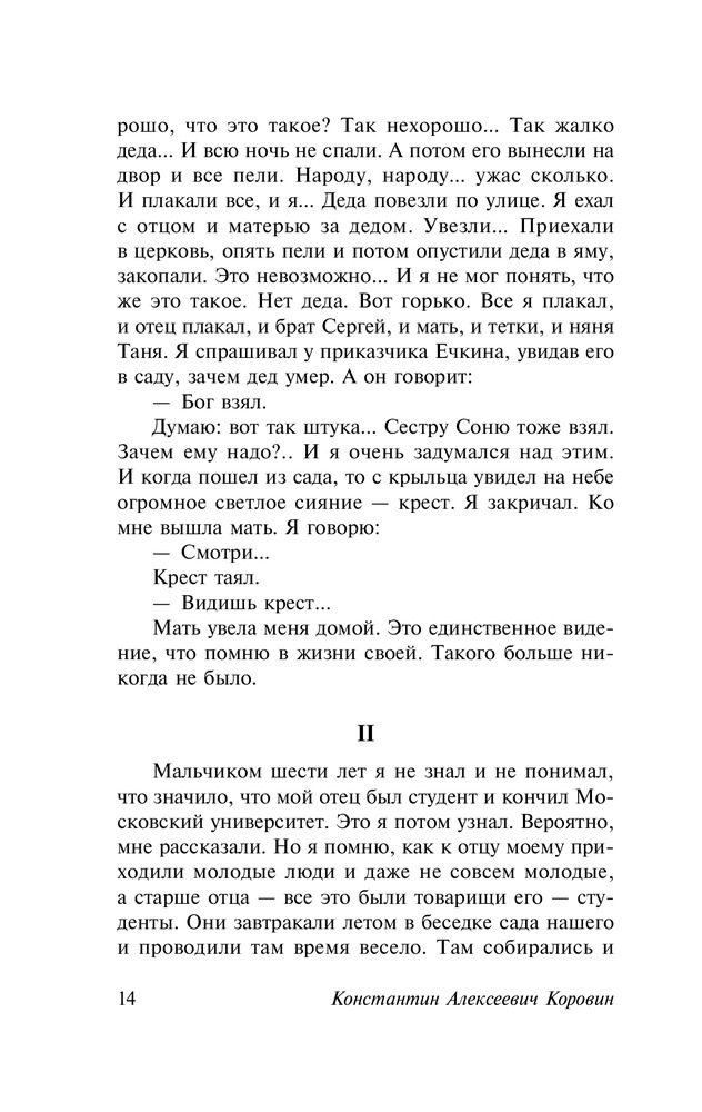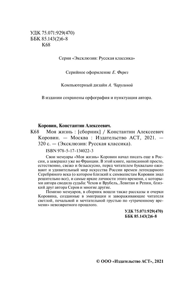 Моя жизньВ данный момент этот товар отсутствует в продаже. Возможно, у нас найдется аналогичный или похожий товар здесь. Серия: Эксклюзив: Русская классика Свои мемуары «Моя жизнь» Коровин начал писать еще в России, а завершил уже во Франции. В этой книге, написанной просто, естественно, свежо и безыскусно, перед читателем буквально оживают и удивительный мир искусства России времен легендарного Серебряного века (о котором близкий к символистам Коровин знал решительно все), и самые яркие личности этого времени, с которыми автора сводила судьба: Чехов и Врубель, Левитан и Репин, близкий друг автора Серов и многие другие. |