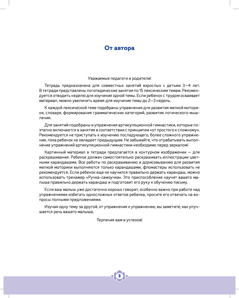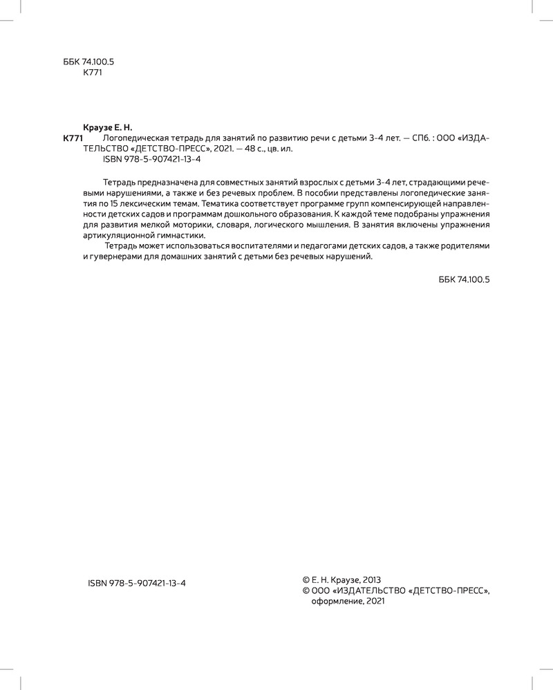 💳 Оплатить за товар можно при получении 🇰🇿 Есть бесплатная доставка по Казахстану от 1 дня 🎁 Копите бонусы с каждой покупки Серия: Коррекционное и инклюзивное образование в ДОО Тетрадь предназначена для совместных занятий взрослых с детьми 3-4 лет, страдающими речевыми нарушениями, а также и без речевых проблем. В пособии представлены логопедические занятия по 15 лексическим темам. Тематика соответствует программе групп компенсирующей направленности детских садов и программам дошкольного образования. К каждой теме подобраны упражнения для развития мелкой моторики, словаря, логического мышления. В занятия включены упражнения артикуляционной гимнастики. Тетрадь может использоваться воспитателями и педагогами детских садов, а также родителями и гувернерами для домашних занятий с детьми без речевых нарушений. |