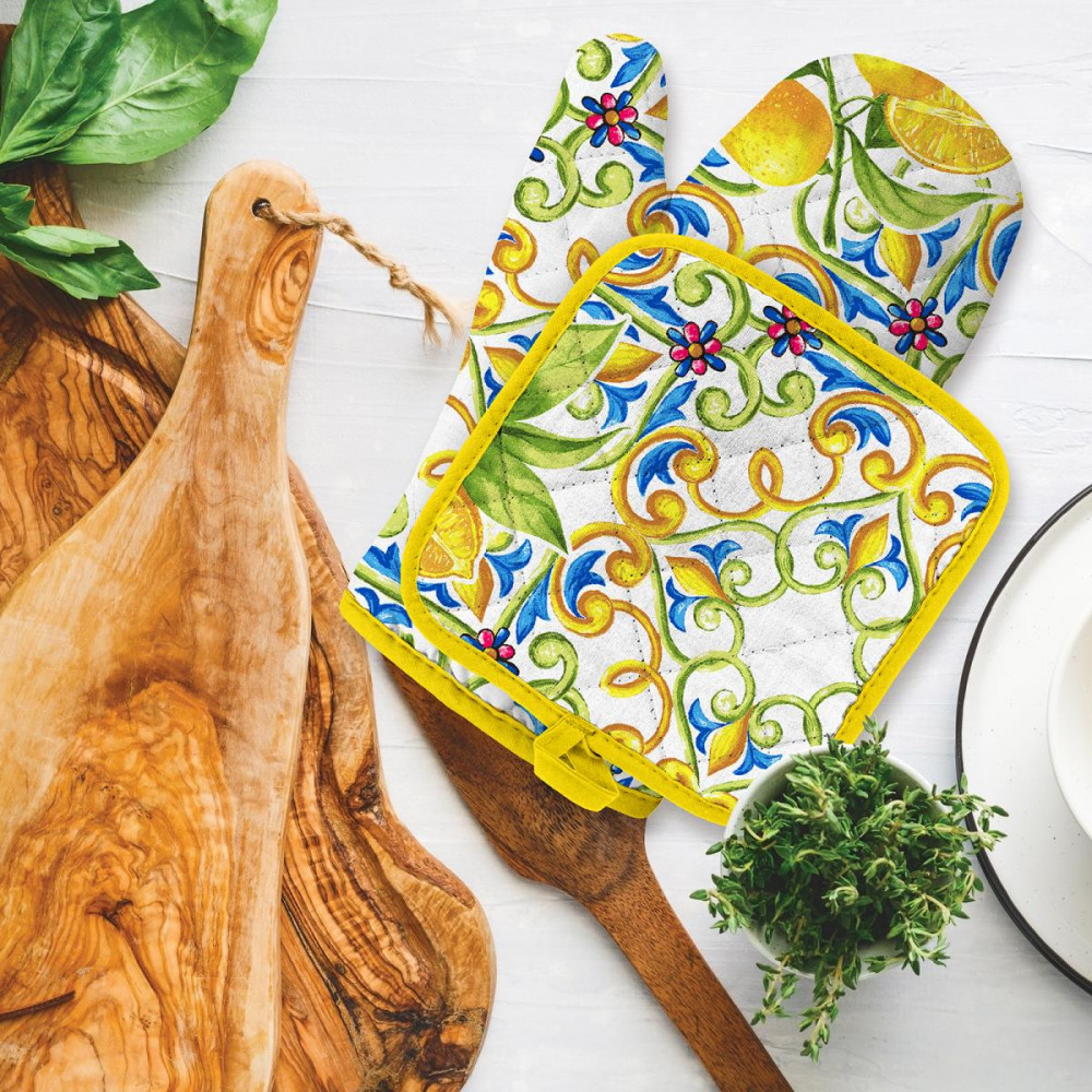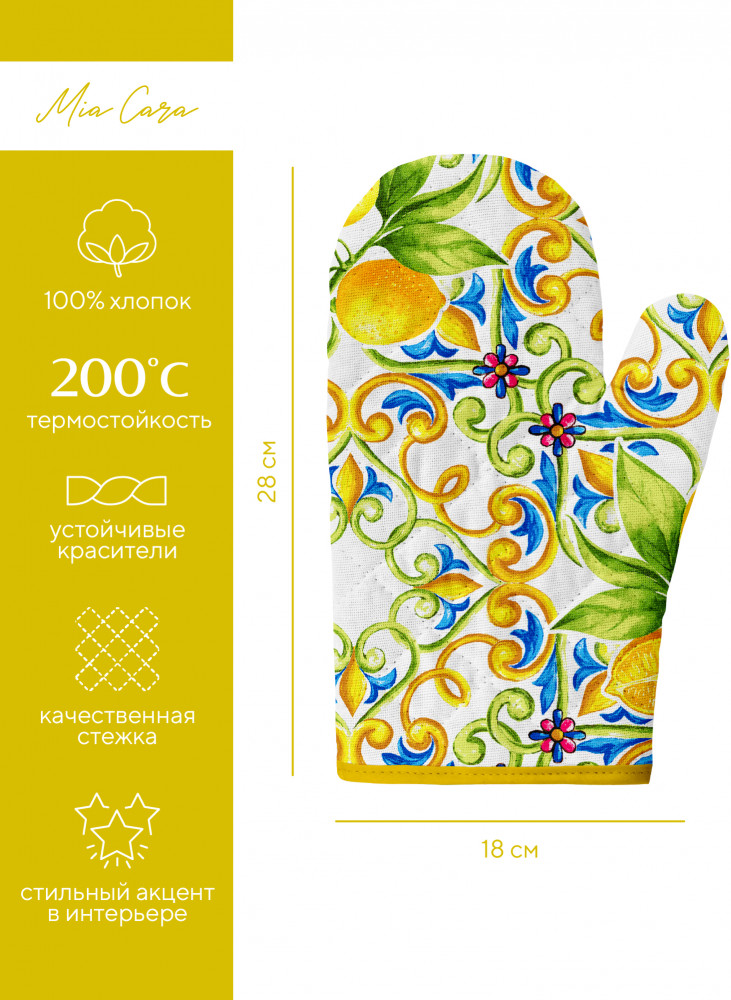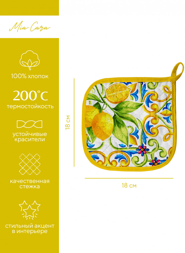 Mia Cara Комплект прихваток кухонныхВ данный момент этот товар отсутствует в продаже. Возможно, у нас найдется аналогичный или похожий товар здесь. Серия: Лимонное настроение Незаменимые аксессуары на любой кухне, которые сделают процесс приготовления комфортным и безопасным. Изделия изготовлены из 100% хлопка, обладают удивительной впитываемостью влаги — до 80%, после стирки становятся более мягкими. Им не страшна многократная стирка, они не теряют своей яркости и мягкости благодаря специальной технологии окраски и качественной ткани. |
