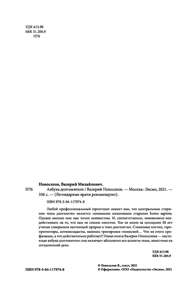 Азбука долгожителяВ данный момент этот товар отсутствует в продаже. Возможно, у нас найдется аналогичный или похожий товар здесь. Серия: Легендарные врачи рекомендуют Любой профессиональный геронтолог скажет вам, что центральным стержнем темы долголетия является понимание механизмов старения homo sapiens. Однако именно они нам точно неизвестны. И, соответственно, невозможно воздействовать на то, что нам не совсем понятно. Тем не менее, за последние 50 лет ученые совершили настоящий прорыв в теме долголетия. Стволовые клетки, геропротекторы, антиоксиданты, наконец тренировки гипоксией... Что из этого профанация, а что действительно работает? Новая книга Валерия Новоселова — настоящая азбука долгожителя — она включает абсолютно все аспекты темы, известные на сегодняшний день. |