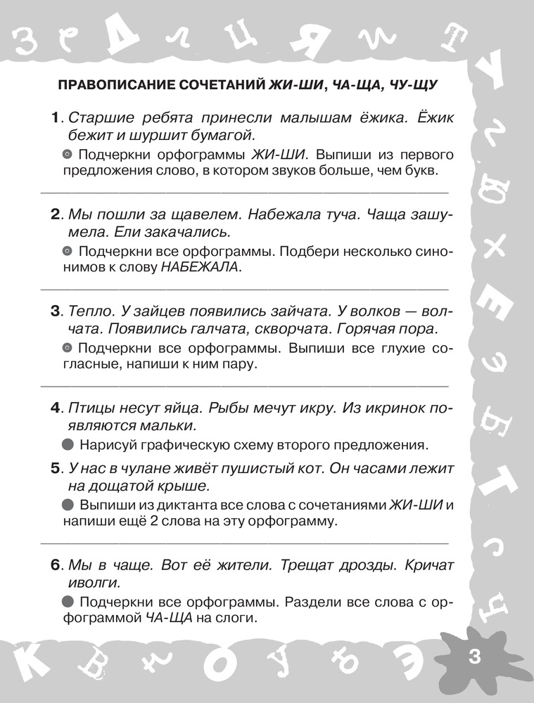 Всего 2–4 предложения, а ваш ученик повторил более 10–15 орфограмм и выполнил грамматическое задание, которое обязательно встретится ему во всех видах контрольных и проверочных работ. Кроме того, предлагаемые тексты можно использовать в качестве диктантов