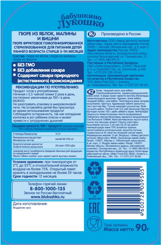 Бабушкино Лукошко Пюре из яблок, малины и вишни
