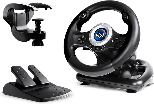 В тандеме с присосками, которые находятся на нижней части блока руля, обеспечивается надежное крепление к столу. Руль также оснащён резиновыми вставками и пластиковыми наплывами, благодаря которым контакт с манипулятором во время вождения будет надёжным и не подведёт даже в самой накалённой ситуации. Предусмотрена возможность регулировать уровень вибрации, чувствительность руля и педалей: в комплекте с моделью поставляется CD-диск с необходимыми драйверами.
