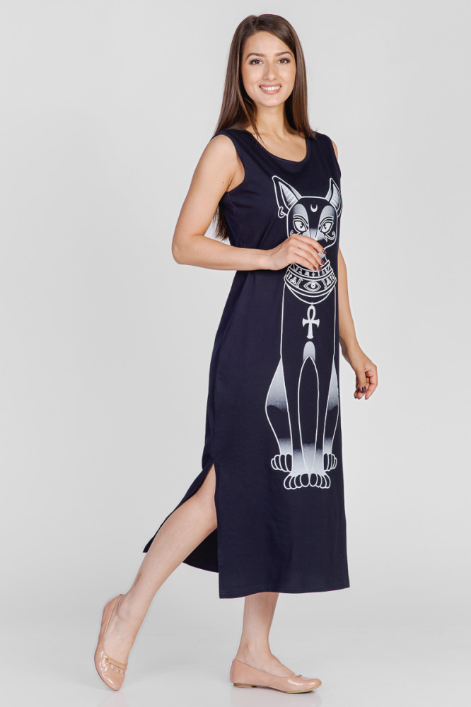Платье понравилось! На параметры 94-83-106 взяла 54 размер, мне было нужно чтобы был свободный фасон, не обтягивало. Если нужно, чтобы село по фигуре, облегающе, нужно брать по размерной сетке. Рисунок - наклейка. Ткань - как у футболки, не просвечивается, на лето в самый раз. Цвет - темно-синий, не линяет.