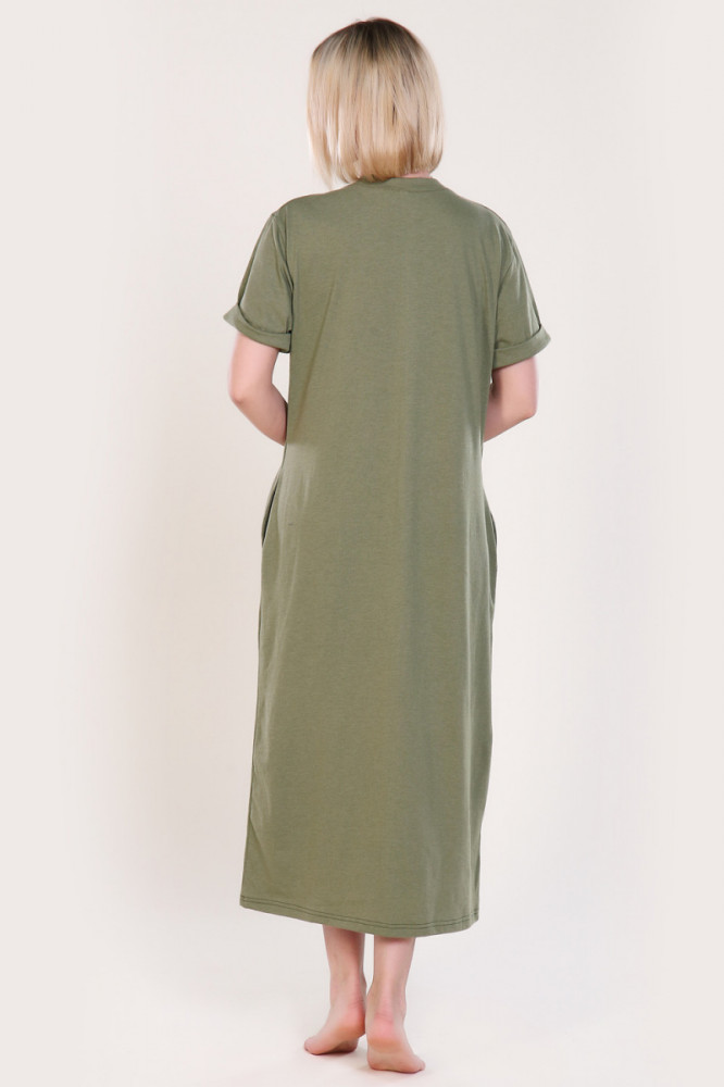 Платье идёт размер в размер. Цвет хаки с уклоном в зелень, не как на картинке, что простит модель. Для дома пойдет в качестве домашней одежды.