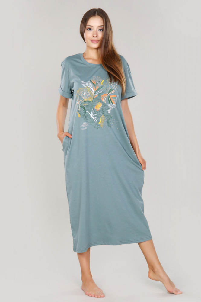 Платье идёт размер в размер. Цвет хаки с уклоном в зелень, не как на картинке, что простит модель. Для дома пойдет в качестве домашней одежды.