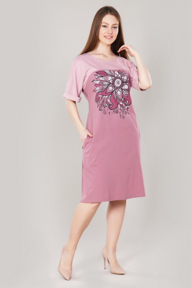 Платье обычное трикотажное. Только для дома. Трикотаж хлопчатобумажный, средней плотности, не тонкий. Размер и длина соответствует заявленным.