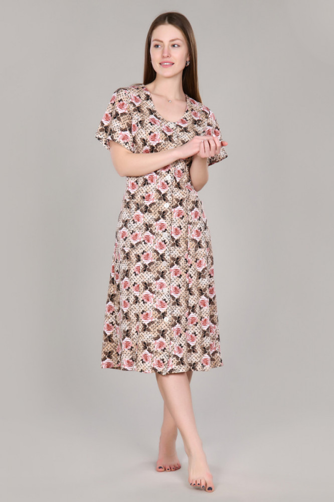 Халатик чудесный, тонкий трикотаж, расцветка спокойная ,идет в размер, мне очень понравился