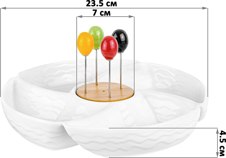 Elan Gallery Менажница «Айсберг волны»В данный момент этот товар отсутствует в продаже. Возможно, у нас найдется аналогичный или похожий товар здесь. Менажница серии «Айсберг волны» имеет 4 секции по краям и центральную секцию с подставкой для шпажек. Менажница позволит вам эстетично подавать к столу закуски, салаты, овощи, фрукты и другие продукты. Шпажки в наборе отличаются по цвету. При желании держатель для шпажек можно убрать и использовать центральную секцию для продуктов. Набор выполнен из высококачественного фарфора и натурального бамбука. Секции менажницы украшены рельефными узорами. Фарфоровые детали набора можно использовать в микроволновой печи и посудомоечной машине. Бамбуковые детали нельзя замачивать. Набор поставляется в яркой картонной упаковке. Менажница из серии посуды «Айсберг волны» сможет стать настоящим украшением кухни или приятным подарком для ваших родных и близких! |