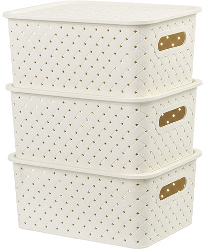 корзины изготовлены из прочного пластика,красивый дизайн.Крышки плотно закрываются,что не мало важно.