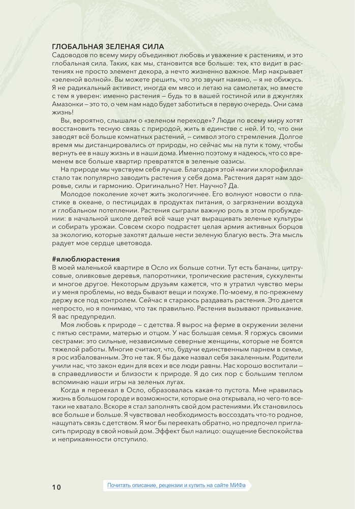 Как бы то ни было, у меня есть несколько советов, которыми я с удовольствием поделюсь: какие растения выбрать и как за ними ухаживать, как растения могут оживить интерьер и как благотворно это может сказаться на вашем самочувствии. Моя цель — сделать так, чтобы вы полюбили растения еще больше! Поэтому желаю вам приятного чтения, и пусть из этого вырастет что-нибудь прекрасное.
