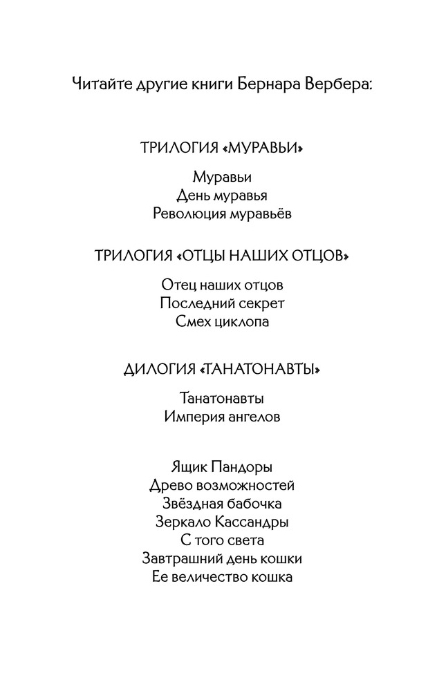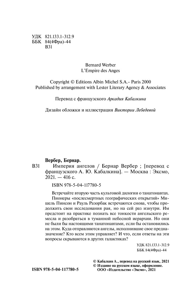 Империя ангеловВ данный момент этот товар отсутствует в продаже. Возможно, у нас найдется аналогичный или похожий товар здесь. Серия: Бесконечная вселенная Бернара Вербера Встречайте вторую часть культовой дилогии о танатонавтах. |