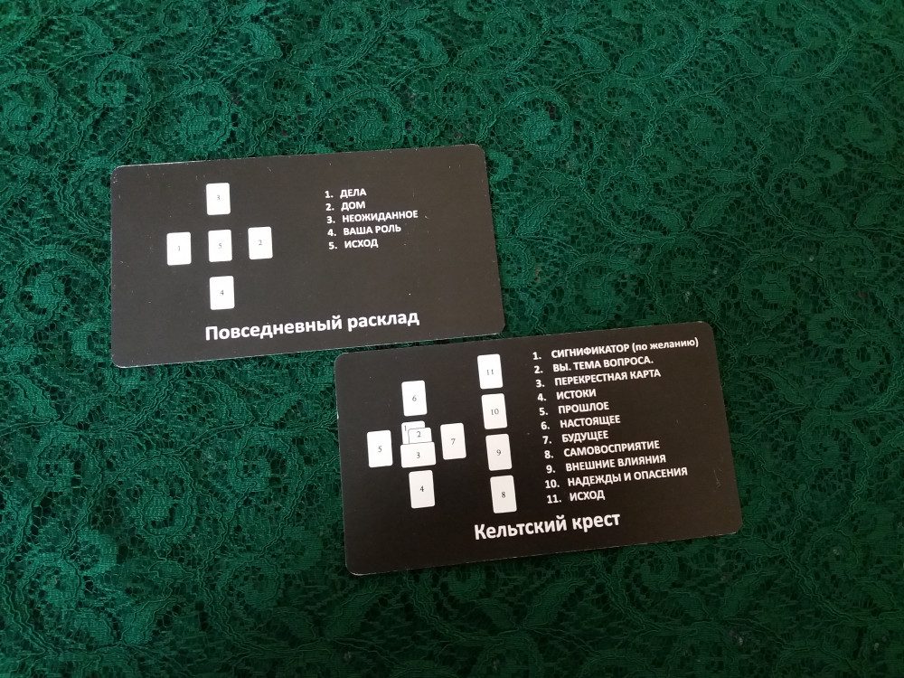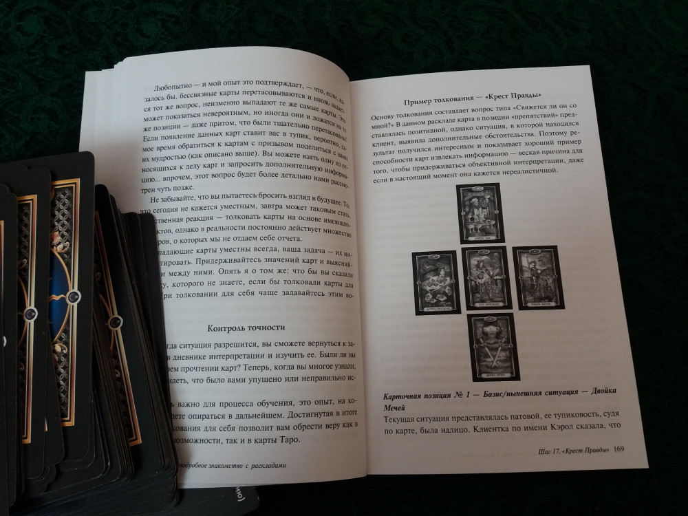 Очень понравился набор! Карты сделаны из плотного мелованного картона. Очень приятные красочные и "живые". Книжечка, входящая в комплект, конечно очень полезная, много примеров интерпретаций на конкретные ситуации, помимо описания смысла карт. Для новичка то, что нужно. Также в набор входит большая карта с нестандартным раскладом "Кельтский крест" и дополнительная карта с традиционной схемой расклада.