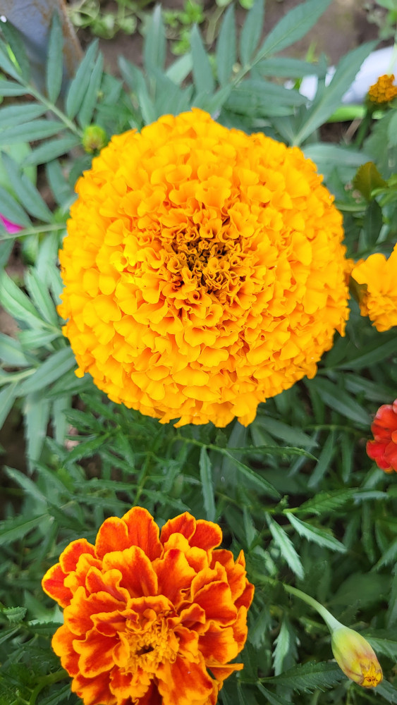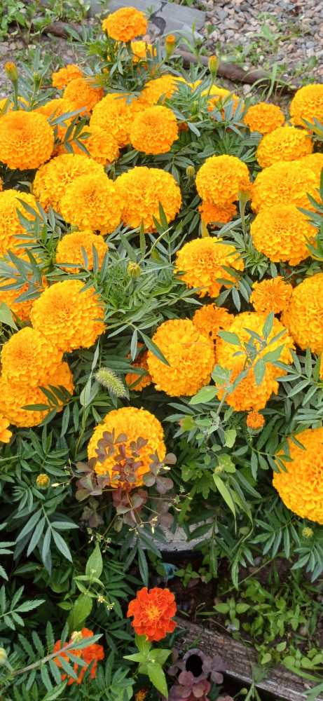 Ширакарные бархатцы. Плодоносят щедро все лето!!! рекомендую!!! украшение участка и букета. Правда, невысокие. Для оформления бордюр и клумбы очень нарядный вариант.
