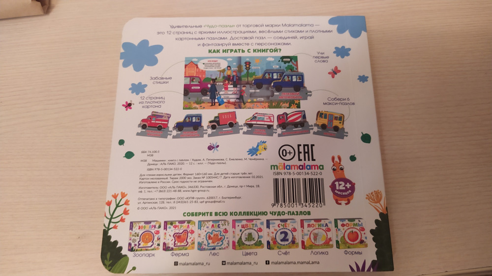 Чудо-пазлы. МашинкиВ данный момент этот товар отсутствует в продаже. Возможно, у нас найдется аналогичный или похожий товар здесь. «Чудо-пазлы. Машинки» — это занимательная книжка с пазлами, на 12 страницах которой находятся весёлые стихи и 6 крупных пазлов. Ребёнок сможет легко извлечь такие пазлы, соединить их между собой и собрать «паровозик», перемещая фигурки по своему усмотрению. Яркая и контрастная печать делает картинки максимально насыщенными. Страницы изготовлены из качественного и плотного картона. |